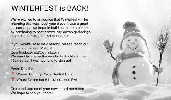 Winterfest is back for its second year! Last year was a fantastic community-driven event that brought everyone together, and this year we hope to recreate that success. There will be food trucks, a marketplace area, a DJ, bounce houses and all kinds of games for the kids!